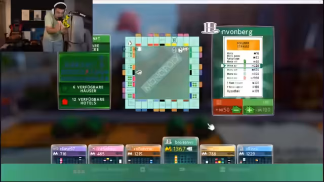 02:12:10Nach den anfänglichen Verzögerungen beginnt die Monopoly-Runde. Das Spiel entwickelt sich zu einem intensiven Wettbewerb, bei dem der Streamer seine strategische Fähigkeiten unter Beweis stellt. Es kommt zu komplexen Handelsverhandlungen zwischen den Spielern, bei denen es um den Tausch von Straßen und finanziellen Ausgleich geht. Der Streamer agiert als eifriger Händler, versucht, günstige Deals auszuhandeln und seine Position im Spiel zu sichern, was das Spielgesprich intensiviert.