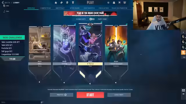 02:10:41Das Team beginnt ein neues Valorant-Spiel und hat die Aufgabe, ihre Charaktere (Agents) auszuwählen. Einige Spieler haben bestimmte Vorlieben, während andere random zugewiesen bekommen. Es gibt Diskussionen über die Stärken und Schwächen der verfügbaren Charaktere und wie diese im Team kombiniert werden können. Die Kommunikation ist wichtig, um eine ausgewogene und starke Teamzusammenstellung zu erreichen.