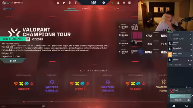 01:43:34Die Gruppe äußert Frustration über die aktuelle Spielsituation und die Schwierigkeiten, die sie erfahren. Es wird der Verdacht geäußert, dass Stream-Sniper ihre Challenge sabotieren, was die Stimmung zusätzlich trübt. Die Spieler diskutieren über alternative Win-Challenges und andere Spiele, die sie anstelle von Fortnite spielen könnten. Es wird vorgeschlagen, zu Valorant zurückzukehren und eine Back-to-Back-Challenge zu starten. Die Gruppe evaluiert verschiedene Optionen, darunter Fall Guys, Party Animals und Minecraft, aber es gibt Vorbehalte gegenüber einigen dieser Spiele. Die Spieler suchen nach einer Möglichkeit, die Challenge interessanter und abwechslungsreicher zu gestalten, während sie gleichzeitig die Frustrationen vermeiden, die durch Stream-Sniper verursacht werden. Die Diskussion zeigt, dass die Gruppe bereit ist, ihre Strategie anzupassen und neue Wege zu finden, um ihre Ziele zu erreichen, auch wenn dies bedeutet, von ihren ursprünglichen Plänen abzuweichen. Die Fähigkeit, flexibel zu sein und auf unerwartete Herausforderungen zu reagieren, ist entscheidend für den Erfolg in der sich ständig verändernden Welt des Streamings.