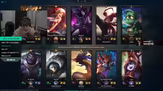 05:48:15Nach dem frustrierenden Spiel in League of Legends versucht der Streamer, die Stimmung aufzulockern und kündigt an, nicht sauer zu sein. Es wird überlegt, was als nächstes gespielt werden soll, und schließlich die Entscheidung für Vollgeist getroffen. Es gibt Diskussionen über die Play-Station und PC-Gaming, wobei der Streamer humorvoll die Vor- und Nachteile beider Plattformen kommentiert. Es folgen Einladungen und Beitritte zu Gruppen, was zu weiterer Verwirrung und humorvollen Kommentaren führt. Der Streamer gesteht ein, dass das vorherige Spiel umsonst war und freut sich darauf, in Vollgeist etwas zu reißen. Es werden Strategien für das neue Spiel besprochen und die Rollen verteilt. Der Streamer gibt Anweisungen und versucht, das Team zu motivieren, während er gleichzeitig humorvolle Kommentare und Beschimpfungen einstreut. Es wird über die Qualifikation und das Erreichen des Finales gesprochen, wobei der Streamer betont, wie wichtig es ist, zusammenzuhalten und als Team zu agieren. Trotz der Herausforderungen und der frustrierenden Momente bleibt der Streamer optimistisch und versucht, die Zuschauer zu unterhalten.
