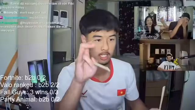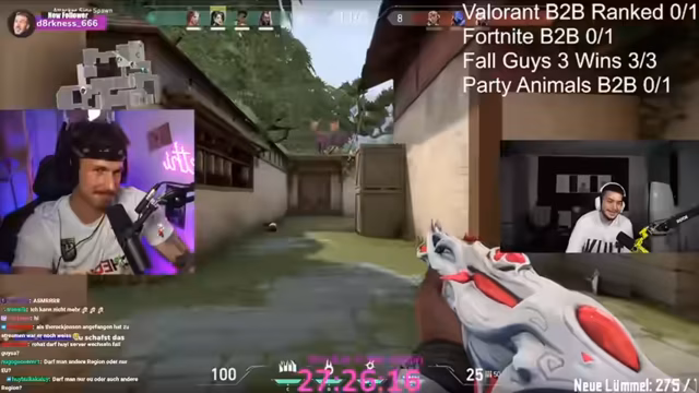 01:50:36Der Streamer organisiert eine Win Challenge für mehrere kleine Streamer, die um ein Preisgeld von 500 Euro konkurrieren. Zunächst müssen die Teilnehmer die Spiele installieren und Steam-Freundescode austauschen, um sich in einer Party zu organisieren. Nach anfänglichen technischen Problemen, wie einem gehackten Account und PC-Neustarts, wird die finale Challenge formuliert. Diese beinhaltet Back-to-Back-Siege in Fortnite und Valorant sowie drei Siege in Fall Guys und ebenfalls einen Back-to-Back-Sieg in Party Animals, alles auf dem Main-Account und im Ranked-Modus.