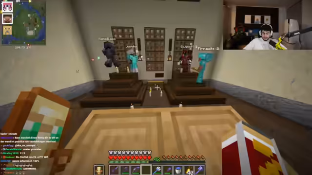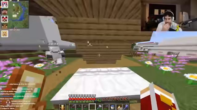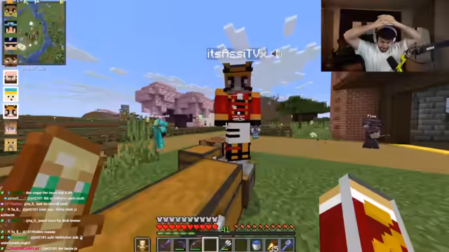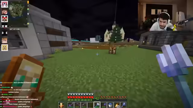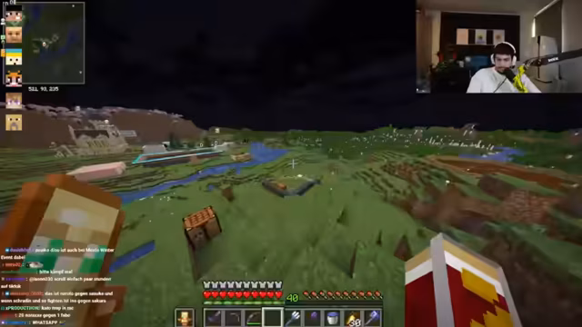 01:38:35Die Stimmung wechselt zu einem kooperativen Projekt. Es gibt Pläne, einen Weihnachtsmarkt zu bauen, an dem mehrere Teilnehmer zusammenarbeiten. Hierfür werden Ressourcen wie Eisen und Smaragde benötigt. Die Teilnehmer handeln über den Tausch von Gütern und diskutieren über das Design der Anlage, wobei esthetische Verschönerungen im Vordergrund stehen. Es herrscht eine konstruktive Stimmung bei der Planung des gemeinsamen Projekts.