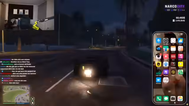 05:30:30Eine dramatische Fluchtsszene steht im Mittelpunkt, in der die Protagonisten mit einem Auto vor Verfolgern durch die Gegend manövrieren. Der Streamer betont die Wichtigkeit, die Polizei nicht zu erkennen und entscheidet sich für ein Motorrad, um unerkannt zu bleiben. Parallel dazu suchen sie den mächtigen Santana auf, der als eine zentrale Figur in der kriminellen Hierarchie angesehen wird. Bei der Begegnung wird Santana von seinen Anhängern mit Respekt und Unterwerzung behandelt, wobei er sich selbst als 'mächtigsten Mann' bezeichnet und seine Macht durch das Aufzwingen von Ehrerbietung untermauert.