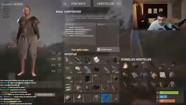 02:58:00Der Stream beginnt mit dem Sammeln von grundlegenden Ressourcen wie Holz, Schweinefleisch und Benzinkanistern. Es werden verschiedene Gegenstände wie Hemden, Westen und Ponchos lootet, die für den Schutz notwendig sind. Die Funktionsweise von Craftingsystemen wird erläutert, aus Knochenfragmenten lässt sich etwa ein Knochenmesser herstellen, das zum Abbau von Tieren oder Zerstören von Fässern genutzt werden kann. Zudem wird erwähnt, dass alle Gegenstände, einschließlich Waffen, im Laufe der Zeit abnutzen und ersetzt werden müssen.