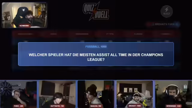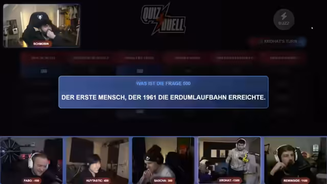 01:04:10Der Stream beginnt mit technischen Schwierigkeiten, da sich der Streamer neu einloggen muss und die Kamera nicht richtig funktioniert. Nach mehreren Versuchen und der Bitte an die Zuschauer, die Seite zu aktualisieren, können die Probleme behoben werden. Die Teilnehmer werden angewiesen, sich in die Lobby zu begeben und F5 zu drücken, um das Spiel zu starten. Es wird erklärt, dass man durch Drücken der Leertaste buzzern kann, um Fragen zu beantworten, wobei das Abstauben nur die Hälfte der Punkte einbringt. Das Quizspiel beginnt mit der ersten Frage, die sich auf einen Streamer bezieht, der 200 Punkte wert ist. Die korrekte Antwort lautet Norex. Es folgen weitere Fragen aus verschiedenen Kategorien wie 'Zurück in die Schule' und 'Song Lyrics', wobei die Teilnehmer unterschiedliche Schwierigkeiten bei der Beantwortung haben und Punkte sammeln oder verlieren.