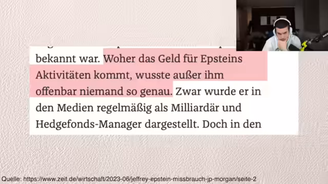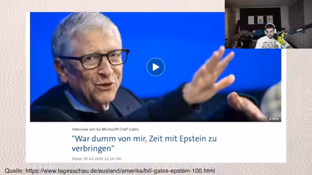 00:38:56Nach einer kurzen Überleitung beginnt der Streamer mit der Besprechung des Epstein-Skandals. Er hat ein Video von Sascha, einer Meinungsmacherin, gesehen, das ihn zum Reden bewegt hat. Er betont, das Thema sei belastend, aber wichtig, und führt in die Hintergründe ein. Es geht um den reichen und einflussreichen Jeffrey Epstein, der einen Sexring mit Minderjährigen betrieb und Kontakte zur internationalen Elite hatte. Der Streamer schildert Epsteins Aufstieg, sein luxuriöses Leben und seine systematische Vorgehensweise zur Einschüchterung von Opfern und Behörden.