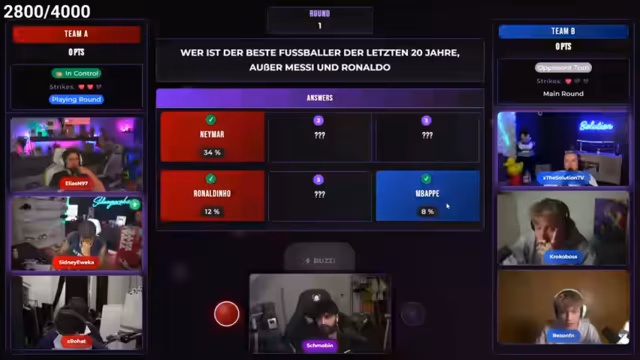 03:05:43Das Format wechselt zu einem Team-Spiel, bei dem die Teilnehmer Fragen beantworten müssen, basierend auf den Top-6-Antworten, die von der Community gegeben wurden. Die erste Frage lautet: 'Wer ist der beste Fußballer der letzten 20 Jahre außer Messi und Ronaldo?' Danny buzzert zuerst und nennt Mbappé, der auf Platz 6 landet. Eli nennt Neymar, der auf Platz 1 ist, und sichert seinem Team die Runde. Das Spielprinzip ist, dass der Spieler, der die höchste Platzierung nennt, weiter raten darf, bis er eine falsche Antwort gibt. Das Team, das die Runde gewinnt, erhält Punkte. Die Schwierigkeit liegt darin, die populärsten Meinungen der Community zu erraten, nicht unbedingt die objektiv 'richtigen' Antworten.
