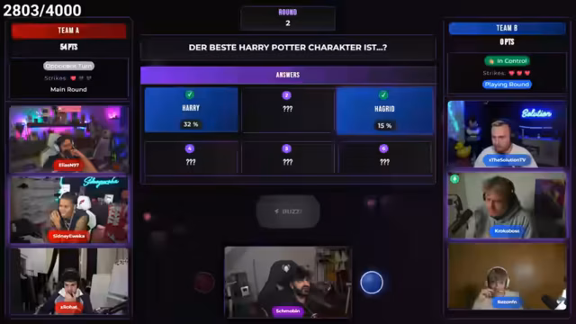 03:14:07Die nächste Frage im Team-Quiz lautet: 'Wer ist der beste Harry Potter Charakter?' Kroko buzzert zuerst und nennt Harry, der auf Platz 1 landet. Er fährt fort mit Hagrid (Platz 3) und Snape (Platz 4). Sirius Black wird von ihm falsch eingeschätzt, woraufhin Reason an der Reihe ist, der jedoch zugibt, Harry Potter nicht gesehen zu haben und keine Charaktere nennen kann. Das Team muss sich beraten, um eine weitere Top-Antwort zu finden. Dumbledore wird als mögliche Antwort diskutiert, aber letztendlich wird Larry genannt, der auf Platz 6 landet und dem Team die Runde sichert. Die Runde verdeutlicht die Herausforderung, die beliebtesten Charaktere einer Community zu erraten.