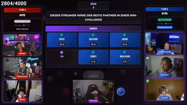 03:18:40Die dritte Frage des Team-Spiels lautet: 'Dieser Streamer wäre der beste Partner in einer Win-Challenge.' Roat und Reason sind an der Reihe. Roat nennt sich selbst, was jedoch nicht in den Top 6 ist. Danny kritisiert Roats Fähigkeiten in Win-Challenges und bezeichnet ihn als unzuverlässig. Kroko wird genannt und landet auf Platz 3. Die Diskussion dreht sich um die Gaming-Fähigkeiten und die Zuverlässigkeit der Streamer in kompetitiven Situationen. Die Spieler müssen einschätzen, welche Streamer von der Community als gute Partner in Win-Challenges angesehen werden, was zu weiteren humorvollen und selbstironischen Kommentaren führt.