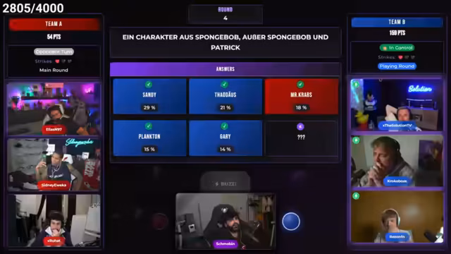 03:26:32Die vierte Frage des Team-Spiels konzentriert sich auf Spongebob-Charaktere, mit der Einschränkung, Spongebob und Patrick auszuschließen. Eli buzzert zuerst und nennt Mr. Krabs, der auf Platz 3 landet. Kroko ist an der Reihe und nennt Plankton (Platz 4), Sandy (Platz 1) und Gary (Platz 5). Mrs. Puff wird von ihm falsch eingeschätzt. Reason, der ebenfalls Schwierigkeiten hat, Charaktere zu nennen, muss passen. Das Team berät sich und entscheidet sich für Larry, der auf Platz 6 landet und dem Team die Runde sichert. Die Runde zeigt erneut die Schwierigkeit, die Top-Antworten der Community zu erraten, insbesondere wenn bestimmte Charaktere ausgeschlossen sind.