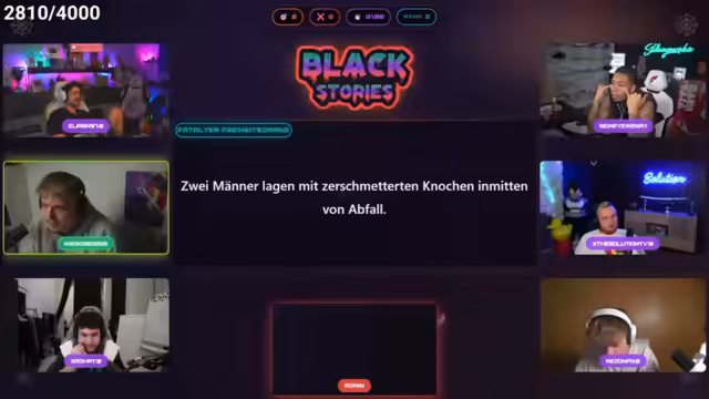 04:06:18Die Black Stories-Runde nimmt Fahrt auf, als die Teilnehmer durch gezielte Fragen dem Fall des 'unvorsichtigen Mannes' näherkommen. Es wird enthüllt, dass die Person erstickt ist und der Gegenstand kleiner als ein Fußball ist. Nach vielen Spekulationen und einem entscheidenden Tipp, dass das Problem jedem passieren könnte, wird die Lösung gefunden: Ein Mann erstickte an der Verschlusskappe eines Nasensprays. Die Absurdität der Lösung sorgt für allgemeine Überraschung und Gelächter. Die nächste Black Story, 'Fataler Freiheitsdrang', handelt von zwei Männern, die mit zerschmetterten Knochen inmitten von Abfall gefunden werden. Schnell wird durch Fragen wie 'War es ein Unfall?' und 'Geht es um eine Müllabfuhr?' die Lösung gefunden: Zwei Sträflinge versteckten sich in einem Müllcontainer, um aus dem Gefängnis zu fliehen, und wurden tragischerweise von der Müllpresse zerquetscht. Die schnelle Lösung dieser Geschichte im Vergleich zur vorherigen zeigt die unterschiedlichen Schwierigkeitsgrade der Black Stories.