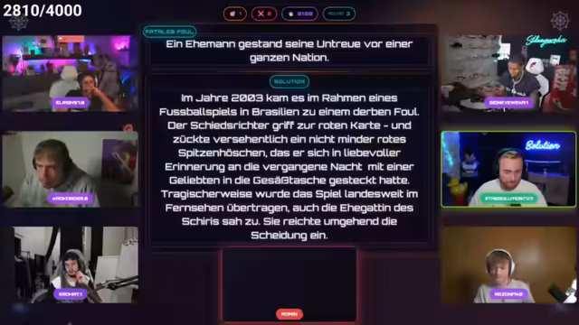 04:16:54Die dritte Black Story, 'Fatales Foul', wird vorgestellt: Ein Ehemann gesteht seine Untreue vor einer ganzen Nation. Die Teilnehmer versuchen, den Kontext durch Fragen nach dem Ort (Stadion, Brasilien), der Art des Ereignisses (Fußballspiel) und der Beteiligung der Ehefrau zu klären. Es wird enthüllt, dass es sich um einen Schiedsrichter handelt, der versehentlich ein rotes Spitzenhöschen aus seiner Tasche zog, als er eine Karte ziehen wollte, was live im Fernsehen übertragen wurde und zur Scheidung führte. Diese unerwartete und humorvolle Auflösung sorgt für große Belustigung. Nach den Black Stories wird ein neues Spiel im Jeopardy-Format eingeführt. Die Kategorien umfassen 'Fußball', 'Anime', 'Flaggen', 'Hauptstädte' und 'Morph' (zwei berühmte Personen gemischt). Die Teilnehmer wählen Kategorien und Punktwerte, wobei bei falschen Antworten Punkte abgezogen werden und andere Spieler buzzern können. Die erste Frage im Fußball-Bereich führt sofort zu einer falschen Antwort und einem Buzzer-Duell, was den kompetitiven Charakter des Spiels unterstreicht.