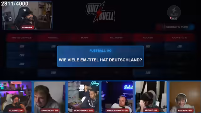 04:41:03Die Quiz-Runde im Stream war von einer Mischung aus leichten und überraschend schwierigen Fragen geprägt, die die Teilnehmer und Zuschauer gleichermaßen forderten. Es begann mit einer Frage nach dem letzten Platz in der Bundesliga, wobei Heidenheim als korrekte Antwort für den Stand von gestern genannt wurde. Eine weitere Herausforderung war die Frage nach der Hauptstadt von Kenia, die korrekt mit Nairobi beantwortet wurde. Auch die Anzahl der EM-Titel Deutschlands sorgte für Diskussionen, da die Antwort nicht jedem sofort geläufig war. Die Schwierigkeit der Fragen variierte stark, was zu einigen amüsanten Momenten und Spekulationen führte. Die Teilnehmer versuchten sich an verschiedenen Kategorien wie Fußball, Hauptstädte und Flaggen, wobei die 500er-Fragen oft zu den größten Hürden wurden und selbst vermeintlich einfache Themen wie die Flagge eines Landes für Verwirrung sorgten. Die Dynamik des Spiels lebte von den spontanen Reaktionen und dem Raten der Teilnehmer, was die Unterhaltung für das Publikum sicherstellte.
