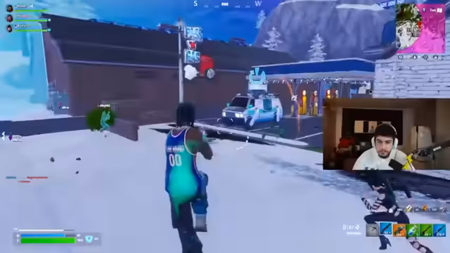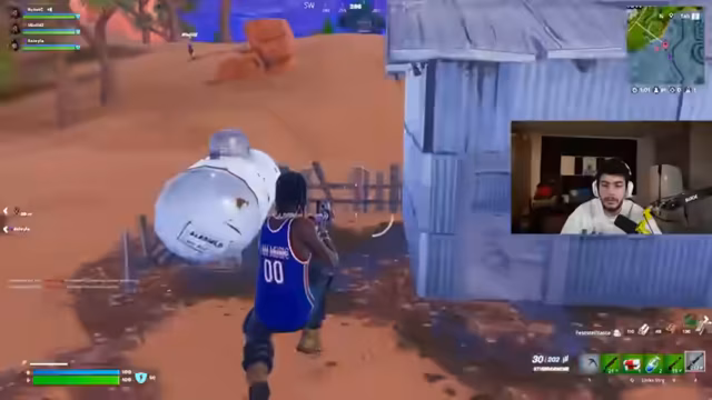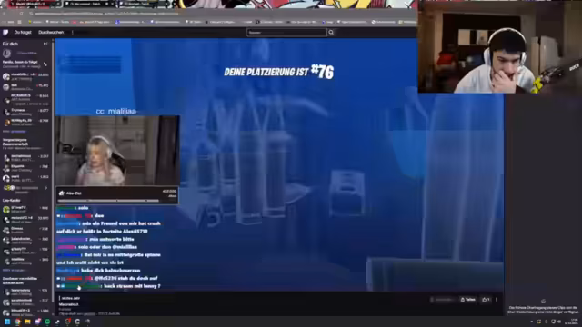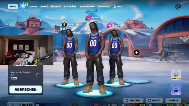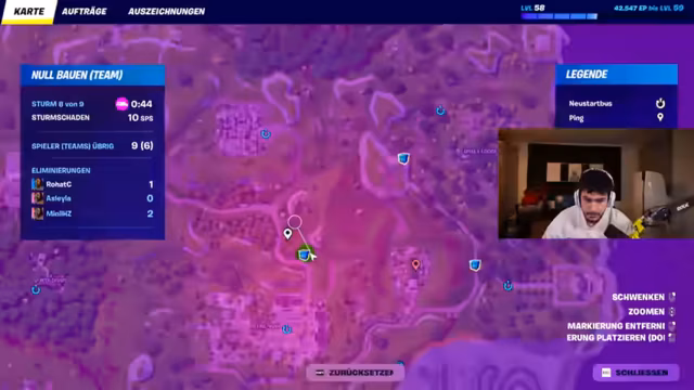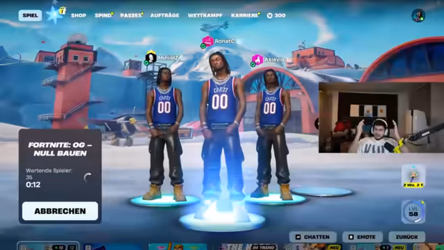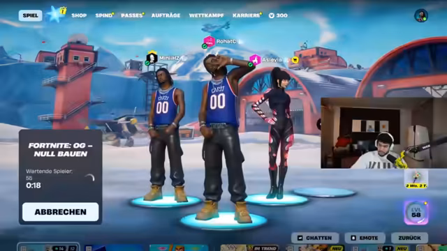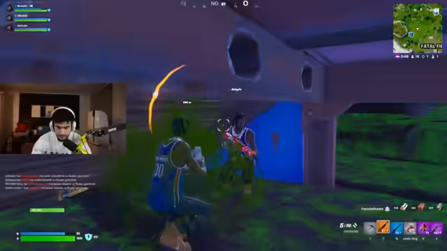 02:47:00Live-Telefonat mit Abu Goku, bei dem die Schenkung eines exklusiven Fortnite-Skins an dessen Sohn besprochen wurde. Anschließend fokussierte sich der Stream auf den Turnierstart: Letzte strategische Absprachen zur Landezone bei der Wüstenrennstrecke, Waffenverteilung und Rollenzuweisungen. Die ersten Kämpfe begannen mit Diskussionen über erlaubte Items, während das Team Lagerfeuer und Bunker für das Endgame vorbereitete.
