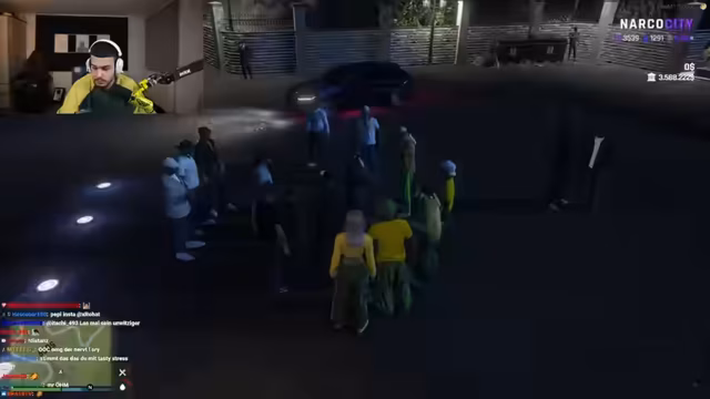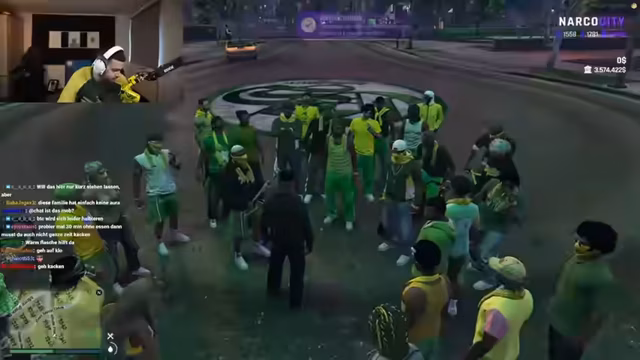 01:48:02Es beginnt eine ausführliche Rollenspiel-Szene in Narko City, bei der eine Geiselnahme stattfindet. Es geht um eine Geiselübergabe und Verhandlungen zwischen verschiedenen Gruppen, darunter die Regierung, die Familie Breitenberg und die Yadis. Die Szene ist von Streit, gegenseitigen Vorwürfen, Drohungen und Verhandlungen geprägt, bei denen es um Freilassungen, Geld und Gegenstände geht.