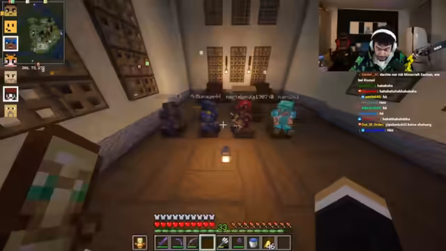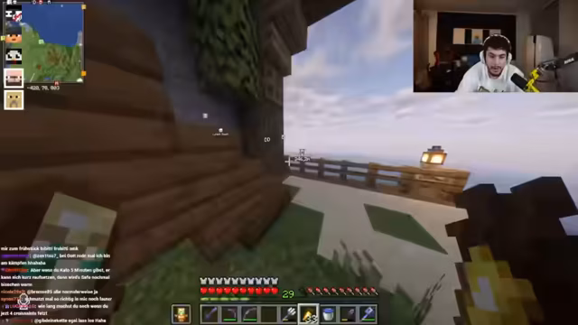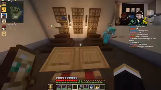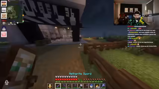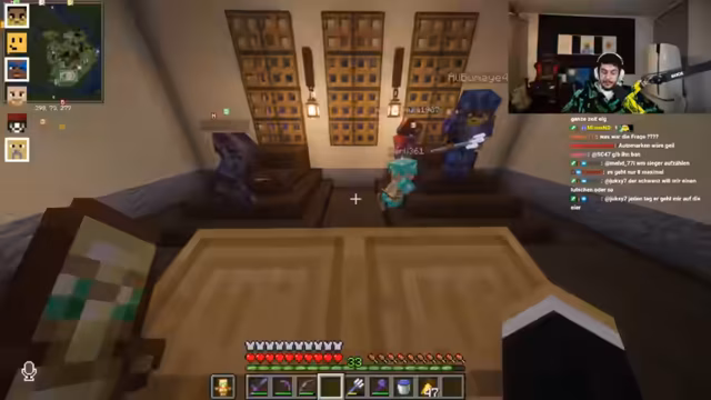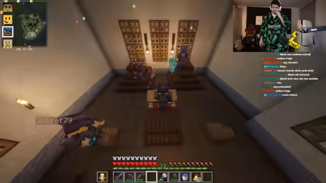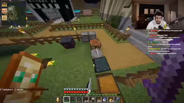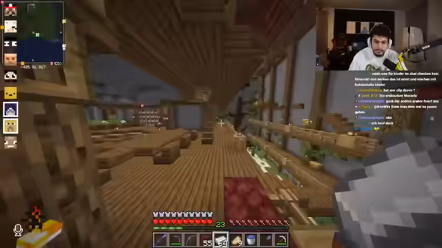 13:00:15Die Gruppe optimiert den Baustil ihrer Basen durch Farbkorrekturen (Hellgrau als Kontrastfarbe) und diskutiert Ressourcen-Beschaffung. Dabei werden praktische Minecraft-Mechaniken erklärt: Sand- und Kiesabbau im Nether, Holzverarbeitung zu Brettern für Villager-Handel sowie das Platzieren von 2x2-Bäumen für optimale Erträge. Kritik wird an ungenutzten Lavasystemen und ineffizienten Farm-Designs geübt, während strategische Koalitionen ('Team Huck vs. Osmanen') thematisiert werden.