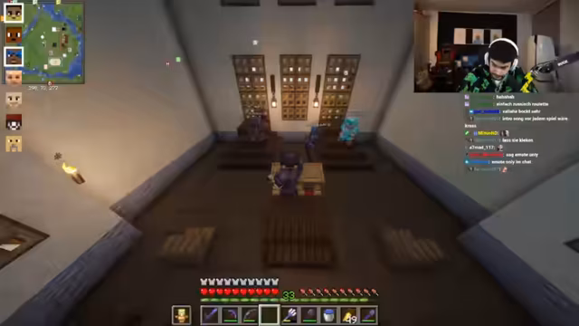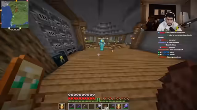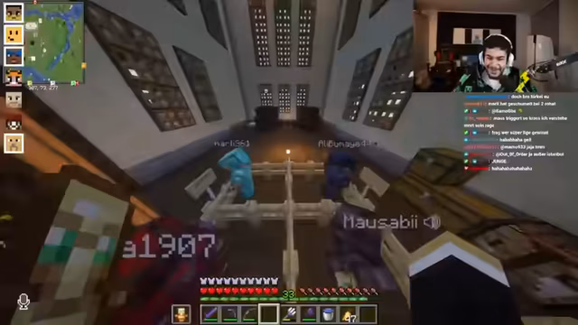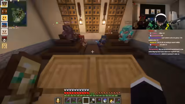 08:08:37Verschiedene Spielergruppen treffen sich, um Ausrüstung zu reparieren und über Baupläne zu diskutieren. 'Noreas' wird als wichtiger Unterstützer ('Bester Mann') gepriesen, der beim Wiederaufbau hilft. Ein Spieler plant ein Rathaus oder ein 'Lodge'-ähnliches Gebäude mit Materialien wie Holz, Quarz, Deep Slate und Cobblestone, um Dimensionen zu schaffen. Debatten entstehen über die Notwendigkeit solcher Bauten im Kontext von Server-Stabilität und möglichen weiteren Angriffen.