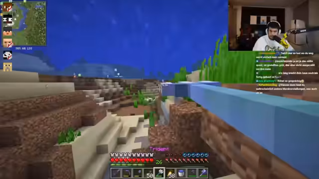 08:04:37Nach der Explosionsfalle verhandeln die Spieler über den Verkauf erbeuteter Dreizacke und anderer Gegenstände. Es kommt zu Preisdiskussionen (z. B. 8 Zaps für einen Dreizack) und Absprachen über den Austausch von Netherite-Ausrüstung. Ein Spieler betont dabei die Wichtigkeit gemeinsamer Anstrengungen ('wir ziehen an einem Strick') und bietet an, einen 'Maze' (Labyrinth-Bereich) zu übernehmen. Die Szene zeigt Übergang von Konflikt zu Kooperation, auch mit Skepsis gegenüber neuen Allianzen.