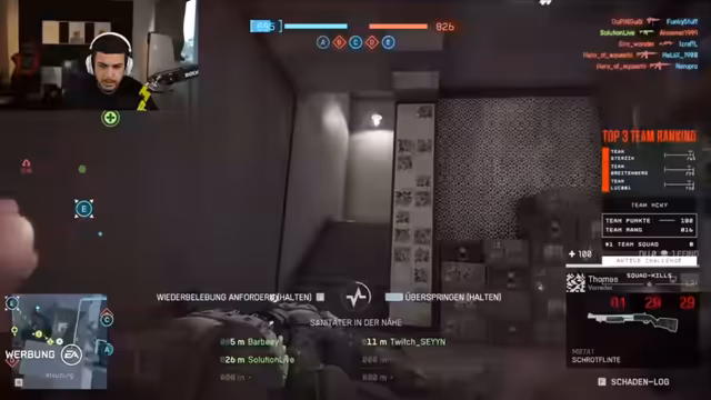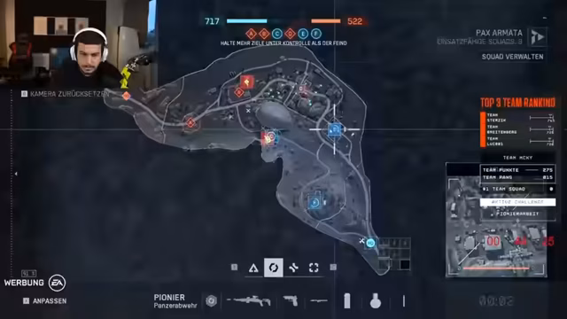 02:40:00Das Team wählt den Spielmodus 'Eroberung' und beginnt die Runde. Es gibt Diskussionen über die Waffenauswahl, wobei Support-Klassen mit Defibrillator favorisiert werden. Der Fokus liegt auf der Teamkommunikation und darauf, immer zusammenzubleiben, um Flaggen zu erobern und gegnerische Spieler zu flanken. Der Streamer betont die Wichtigkeit des gemeinsamen Vorgehens.