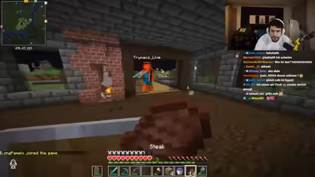 02:35:24Die Spieler sammeln Diamanten, um sich Rüstung und Werkzeuge zu verzaubern. Ein Spieler gründet die Fraktion 'Generation Geil' und lädt andere Spieler ein, sich ihnen anzuschließen, um sich gegen das Kaiserreich zu verbünden. Es wird über einen geplanten Angriff auf die Basis von Zabex und Schradin diskutiert, wobei Koordinaten ausgetauscht werden. Der Streit zwischen den Parteien eskaliert weiter, während gleichzeitig Pläne für den Bau eines gemeinsamen Café-Unternehmens geschmiedet werden, was für eine ironische und unharmonische Stimmung sorgt.