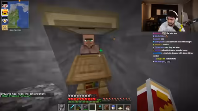05:05:19Ziel der Streamer ist die Bildung einer Allianz, um Villager zu tauschen und gemeinsam am Server zu agieren, insbesondere im Angesicht eines erwarteten großen Krieges. Zentraler Punkt der Verhandlung ist der Versuch, an Eisen zu gelangen. Trimax wird als Hauptziel identifiziert, da er über eine Eisenfarm verfügt, aus der der Server die Ressourcen stehlen möchte. Der Streamer präsentiert ein Angebot: Er stellt die Villager zur Verfügung, im Gegenzug erwartet er Eisen für den Bau seiner Projekte wie einer Brücke. Trimax wird zum gemeinsamen Feind erklärt.