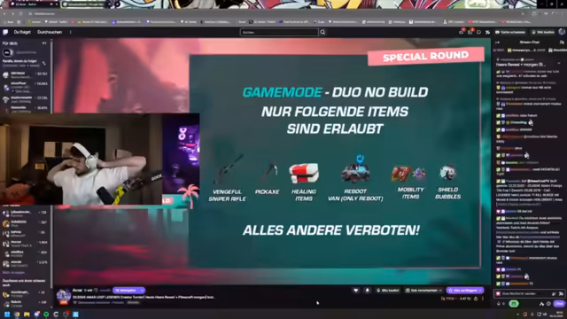 00:37:28Kurz vor dem eigentlichen Turnierstart werden die spezifischen Regeln für die Sonder-Runde bekanntgegeben. Diese weicht von der Null-Bau-Standardrunde ab. Erlaubt sind nur noch bestimmte Items wie Jetpacks, Impulse, Schildblasen, Schilde, Medkits und Reboots. Alle anderen Waffen, Granaten oder Fahrzeuge sind verboten, was das Gameplay grundlegend verändert.