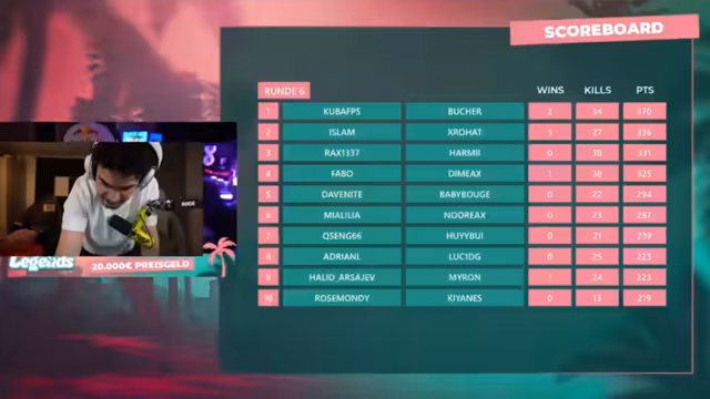 05:24:59Das Team erreicht nach der Finalrunde Platz 2 oder 3. Der Gewinn entgeht knapp – Kuba holt den Sieg durch starke Performance. Der Streamer analysiert kritisch: Ein besserer Start in der ersten Runde hätte den Gesamtsieg ermöglicht ('100% erste Runde'). Trotzdem zeigt er Respekt vor den Kontrahenten und würdigt das starke Field. Die Preisgeldverteilung für Top 3 wird bestätigt, wobei der zweite Platz knapp verpasst wurde.