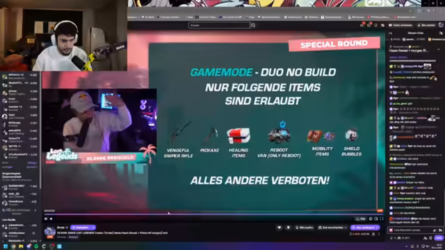 01:18:45Der Streamer gibt finale Turnierinformationen: Es sind sieben Runden geplant, mit einer speziellen Finalrunde. Deutlich werden die Regeln - erlaubt sind Sniper, Jetpacks, Shield-Bubbles und Heilitems, während Autos und alle Explosivstoffe verboten sind. Reboot-Vans sind neu und erlaubt. Das Preisgeld wird mit 5.000 Euro bestätigt. Der Streamer appelliert an die Community, die Regeln zu beachten, und kritisiert kurzfristige Absagen anderer Teilnehmer.
