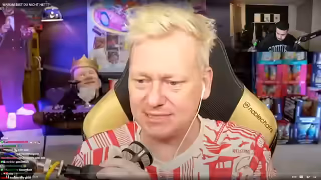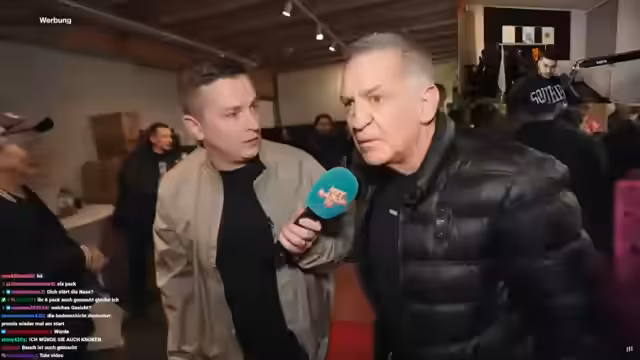 04:09:22Der Streamer befindet sich bei einer Promi-Veranstaltung, bei der er verschiedene bekannte Personen aus der deutschen Unterhaltungsbranche trifft. Es werden kurze, oft humorvolle und absurde Interaktionen mit diesen Promis gezeigt, wie zum Beispiel ein Toast mit Sat.1-Chef Didi Hallervon. Parallel dazu steigt der Alkoholkonsum des Streamers deutlich an, was sich in seinem Verhalten und seinen Aussagen, die zunehmend vonGetX064GetriX064nget werden, widerspiegelt.