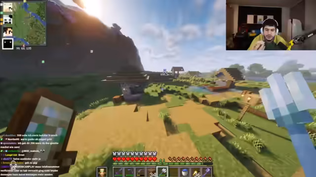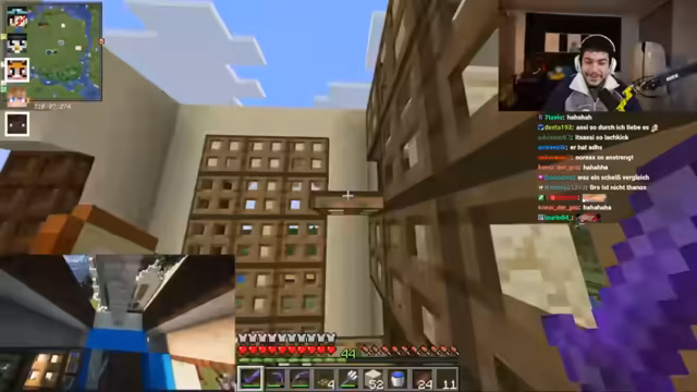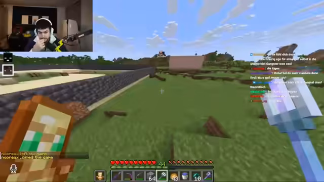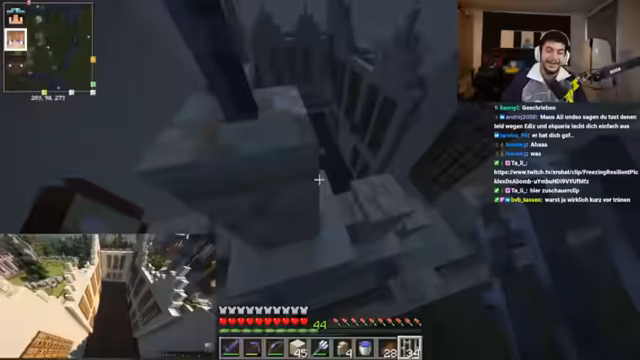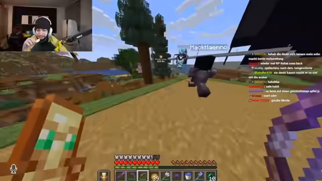 01:43:31Der Streamer fordert einen 1-gegen-1-Kampf gegen einen Mitspieler (vermutlich Reeps), bei dem er gewinnen will, um als 'Gotti' bezeichnet zu werden. Der Kampf findet mit Schwertern und unter Nutzung von Totems statt, endet aber unentschieden oder mit Verlusten für den Streamer, der frustriert reagiert ('Scheiße, warum bin ich scheiße in diesem verfickten Kinderspiel?'). Es folgt eine längere Diskussion über einen Konflikt mit Noriak, bei dem der Streamer vorwirft, dass dieser ihn ständig therapieren und seine Zeit verschwenden würde. Noriak habe versehentlich seine Farm zerstört, was zu einem Streit führt, bei dem der Streamer eine Entschädigung in Diamanten fordert. Später kommt es zu einer Versöhnung: Der Streamer entschuldigt sich für sein Verhalten, und Noriak bietet zusätzliche Gegenstände (Spitzhacke, Schaufel, Bett, Rüstung) an, um den Schaden auszugleichen. Beide betonen, dass es nur Minecraft ist und keine persönliche Feindschaft besteht.