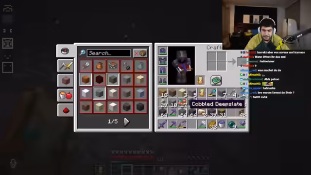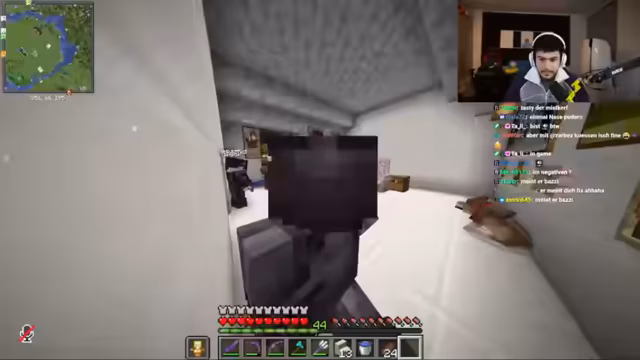03:33:02Der Streamer versucht Stärke-Potionen herzustellen, scheitert aber an fehlenden Zutaten. Er diskutiert mit dem Chat über Blaze Powder, Redstone und Nether Warts. Trotz mehrerer Versuche funktionieren die Tränke nicht, vermutlich wegen falscher Reihenfolge oder fehlender Komponenten. Er ist frustriert von den Jägern und sucht nach Lösungen, während er gleichzeitig seine Verfolger abwehren muss.