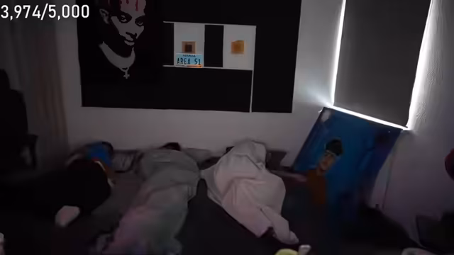 06:55:10Während des gemeinsamen Schlafens kommt es zu viel Unruhe und spielerischem Streit. Die Streamer beschweren sich über ungemütliche Schlafpositionen, Körperkontakt und störende Geräusche. Sie fordern die Zuscherrer auf, die interaktiven Sounds auszulösen, während sie selbst mit dem Schlaf kämpfen und sich gegenseitig necken. Das Geschehen wirkt unorganisiert und chaotisch.