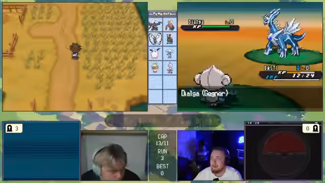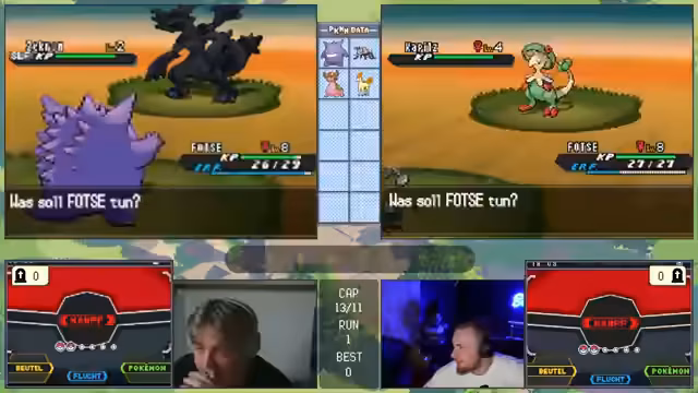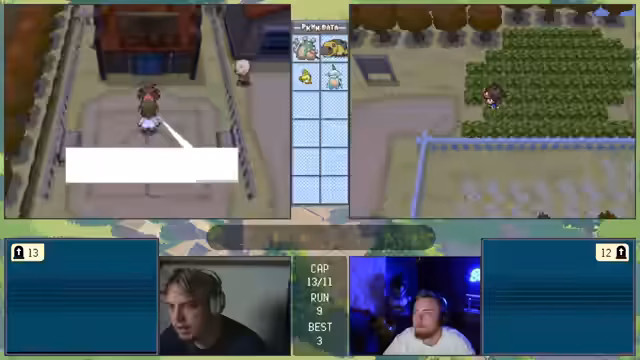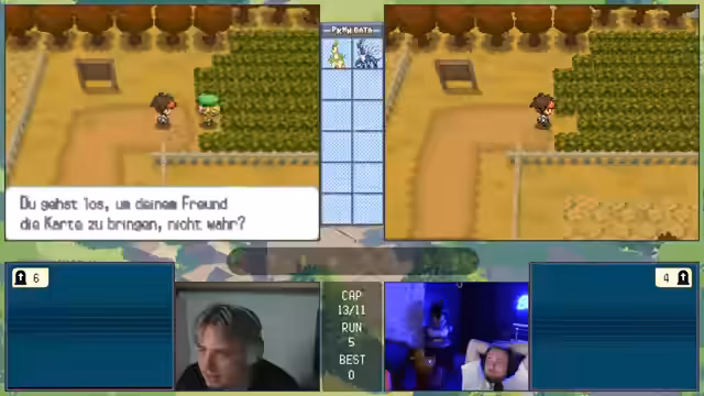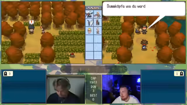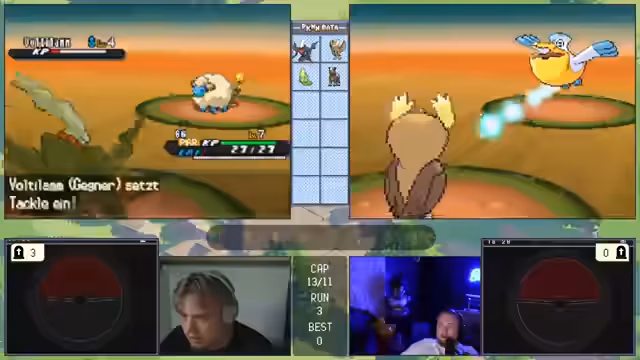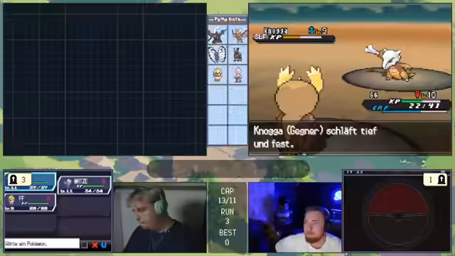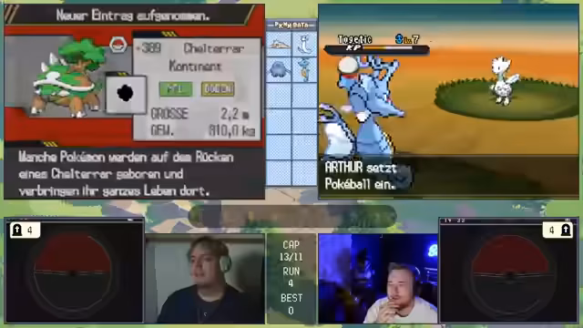 00:11:28Die Challenge beginnt mit den gleichen Regeln wie beim letzten Mal, aber da nur noch zwei Streamer teilnehmen, ist sie entspannter. Das Ziel ist es, innerhalb von 10 Versuchen zu bestehen. Beim ersten Encounter in Viridian City wird ein Gastrodon gefangen, das mit dem Traubball gefangen wird und als sehr starker Start gilt. Ein Pokémon mit Feuerattacke wäre gefahrlich, doch die Stahl/Käfer-Typing bietet gute Verteidigung. Der Start wurde als exzellent bewertet.