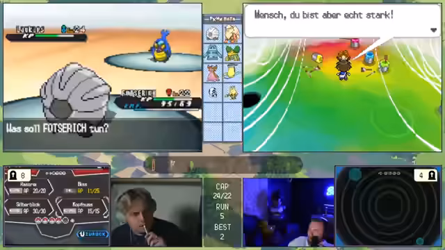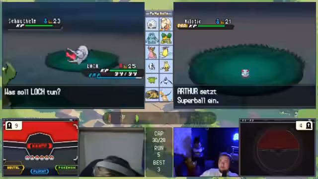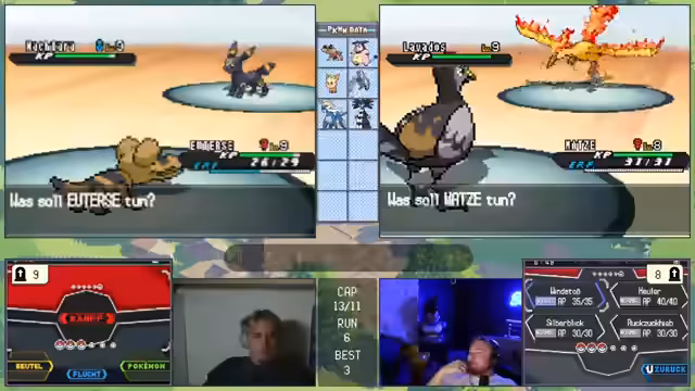07:37:48Nach mehreren gescheiterten Versuchen gibt es einen Moment der Hoffnung, als ein Pokémon namens Loki gefangen und als "exzellenter Link" gefeiert wird. Der Streamer ist optimistisch, dass dieser Run trotz anfänglicher Schwierigkeiten durch einen guten Fang gerettet werden kann. Die Freude ist jedoch von kurzer Dauer, da ein späterer Konfrontation mit einem Gegner namens Lamus zum abrupten Ende des Runs führt, was den Streamer zu emotionalen Ausbrücken wie "Hurenschlag, du Hurensohn!" verleitet.
