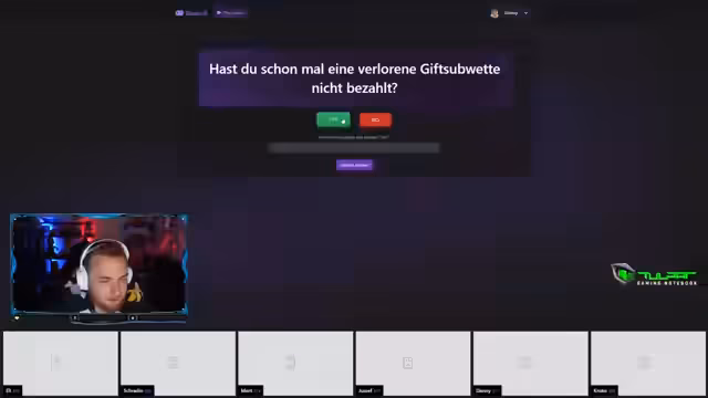 03:12:57Das letzte Spiel des Quiz besteht aus Ja-Nein-Fragen, bei denen die Teilnehmer auch schätzen müssen, wie viele Leute mit Ja antworten würden. Die erste Frage lautet, ob man zu viel TikTok benutzt. Es folgen Fragen, ob man schon mal die Schule geschwänzt hat oder auf einem Konzert war. Eine weitere Frage zielt darauf ab, ob man schon mal ein Placement angenommen hat, das man im Nachhinein bereut. Es wird auch gefragt, ob man schon mal ins Becken uriniert hat, sowie ob man mehr als drei Mal am Tag Hand angelegt hat. Die Frage, ob Messi besser als Ronaldo ist, sorgt für Kontroversen. Es folgen Fragen, ob man Abitur hat und ob man gerne größer wäre. Die Stimmung ist ausgelassen und humorvoll, während die Teams um die letzten Punkte kämpfen. Fragen, ob man schon mal den Stream ausgemacht hat, wegen zu wenig Zuschauern oder ob man einen Controller zerstört hat, werden gestellt. Auch, ob man eine verlorene Giftsabwette nicht bezahlt hat oder ob man sich mal in den letzten fünf Jahren eingekackt hat, wird gefragt. Abschließend wird gefragt, ob man eine falsche Identität benutzt hat, ob man bei einem Spiel geschummelt hat, um Geld zu gewinnen, und ob man mal eine Lüge über seine Dating-Vergangenheit erzählt hat.