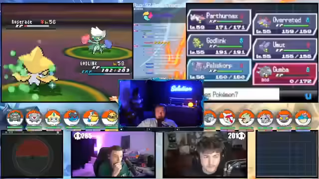 00:42:53Das aufgestellte Pokémon-Team tritt nun in den Kämpfen gegen starke Gegner an. Der Streamer passt seine Strategie dynamisch an den jeweiligen Gegner an, wechselt Pokémon und nutzt Items wie Tränengas oder Eier. Die Kämpfe sind von Glück und Pech geprägt, durch RNG bei Crits, Status-Effekten und Misses. Der Streamer ruft ständig Anweisungen in den Chat und reagiert auf die Entwicklungen des Geschehens, wobei die Spannung im Kampf um den Einzug in die Top 4 steigt.