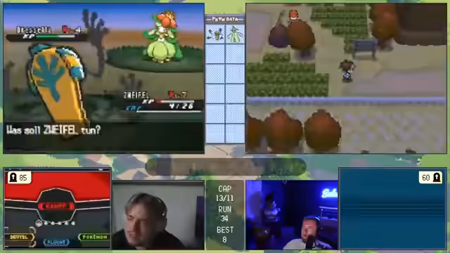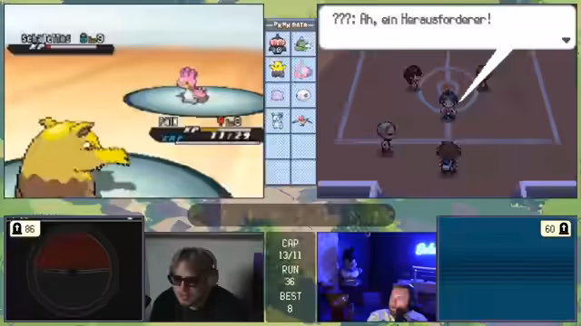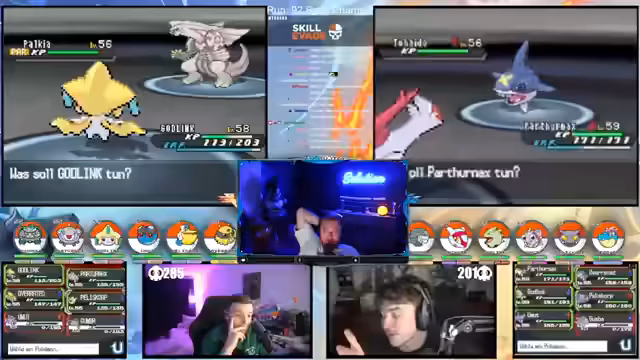 01:25:21Ein wiederholter Versuch in der Top 4 des Nuzlocke zeigt einen sehr knappen Kampf, bei dem der Streamer mit nur wenigen Pokémon gegen einen starken Gegner antritt. Trotzdem wird ein Pokémon nach dem anderen eliminiert, insbesondere ein Palkia, das als sehr gefährlich eingestuft wird. Der Fokus liegt auf den Pokémon-Attacken wie Raumschlag und den notwendigen Strategien wie Wechsel und das Risiko eines Donnerwelle-Flinch-Gambles.