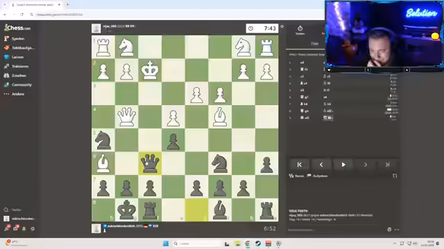 00:32:11Als Nächstes spielt der Streamer ein Schachspiel und gerät schnell in Frustration. Er fühlt sich trotz guter Eröffnungsstellung unfähig und verliert Partien, obwohl er nach eigener Aussage in den meisten Fällen in Gewinnstellung steht. Seine Selbstzweifel sind groß, er beschreibt sich selbst als Bastard und absolutes Stück Scheiße, und er überlegt, seine Schachfähigkeiten grundlegend zu verbessern, indem er sich auf festen Eröffnungen konzentriert.
