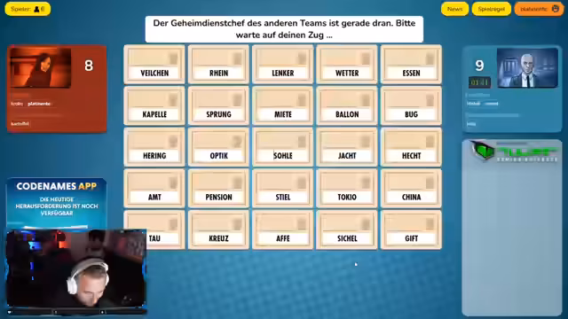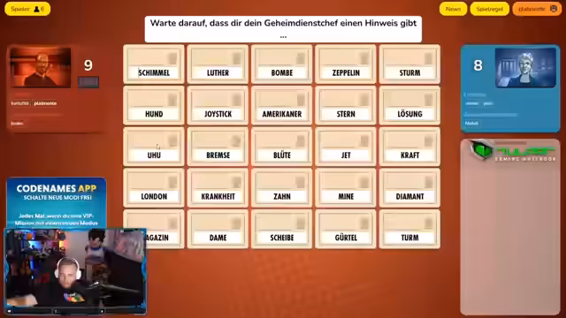 04:53:01Das Spiel Codenames steht im Mittelpunkt und führt zu ausgedehnten, oft humorvollen Wortinterpretationen und Debatten. Die Teams müssen ihre Hinweise durch verschiedene Kategorien wie Länder, Begriffe oder kreative Kombinationen abdecken. Spieler wie Noah und Miki stellen die Wörter 'Kürbis' und 'ersticken' vor, was zu kontroversen und unkonventionellen Lösungsansätzen führt, die die Spieler an ihre Grenzen bringen.