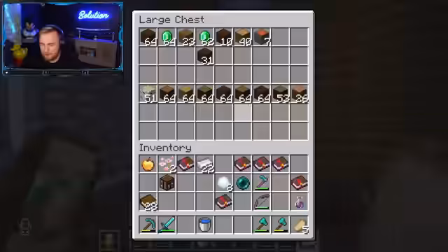04:08:37Zur Wiederherstellung der Rüstung werden gezielt Smaragde, Bücher und Level benötigt. Um die unzureichende Menge an Smaragden auszugleichen, wird das Farmen von Holz beschlossen. Aus Holz werden Stöcke hergestellt, welche dann mit Dorfbewohnern gegen Smaragde getauscht werden können. Der Streamer kümmert sich parallel darum, die benötigten Level zu farmen. Nachdem ausreichend Holz gesammelt wurde, wird es direkt zu Smaragden verarbeitet, um das Ziel einer reparierten Rüstung zu erreichen.