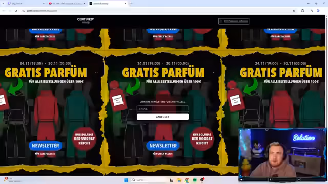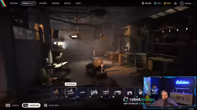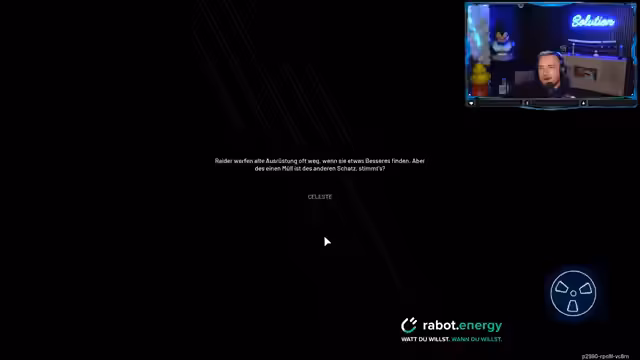 00:49:29Der Streamer bereitet sich auf eine 'dicke Arc Raiders Session' mit Carsten um 20:30 Uhr vor und äußert seine Begeisterung für das Spiel. Er hat vier Rucksäcke und überlegt, welche Schildkompatibilität (leicht, mittel, schwer) die 'Geeks' bevorzugen. Es wird ein 'Geschenk' in Form eines Anhängers aus der E-Mail-Verifikation entdeckt. Er bastelt an einer Werkbank und versucht, mechanische Komponenten und Gummi zu finden, um seine Ausrüstung zu verbessern. Der bevorstehende 'Certified Drop' am Montag, dem 24.11. um 19:00 Uhr, wird beworben. Es werden Tracksuits in drei Farben (schwarz, rot, grün) angeboten. Ab einem Bestellwert von 100 Euro gibt es ein Parfüm dazu, und der 'alte Stock' ist um 10 Euro reduziert. Es wird die Möglichkeit erwähnt, sich für den Newsletter oder den WhatsApp-Kanal anzumelden, um einen halbstündigen Early Access zum Shop zu erhalten.
