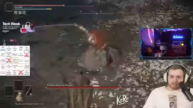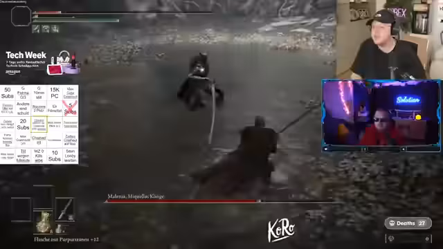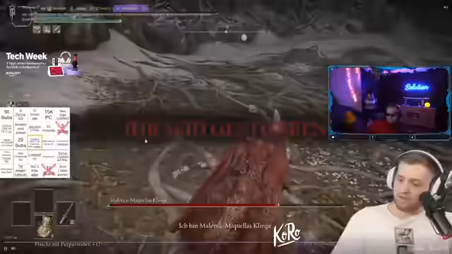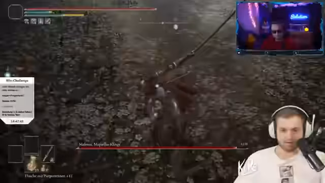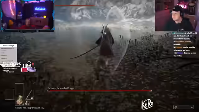 00:41:13Der Stream konzentriert sich auf Coaching für das Spiel 'Dark Souls', insbesondere für den Bossgegner Malenia. Der Streamer gibt detaillierte Anweisungen für Ausweichmanöver, Angriffsmuster und die Verwaltung von Ressourcen wie Ausdauer und Lebenspunkten. Es gibt wiederholte Versuche, Malenia zu besiegen, begleitet von Tipps und Verbesserungsvorschlägen.