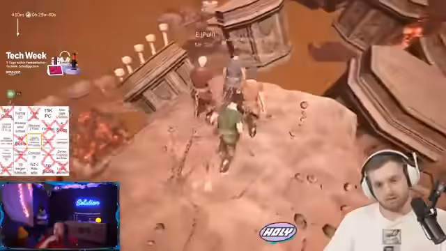 12:11:07Ein Teilnehmer kämpft gegen einen schwierigen Boss in der zweiten Phase des Spiels. Es werden intensive Strategien entwickelt, um den Boss zu besiegen, einschließlich Heilung, Ausweichmanövern und effektiver Waffennutzung. Das Team kommuniziert untereinander, um die bestmögliche Taktik zu finden, während der Streamer die Aktionen kommentiert und Ratschläge gibt.