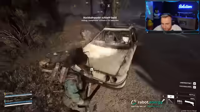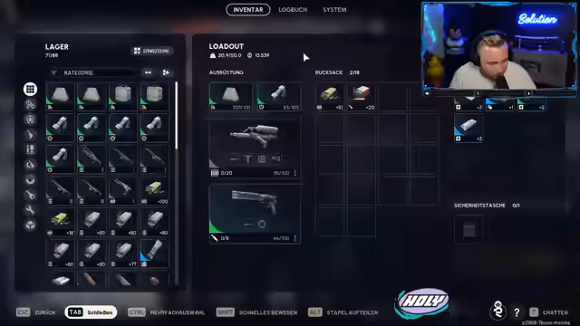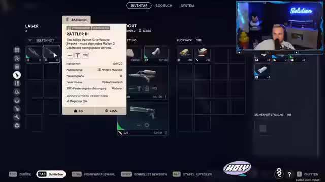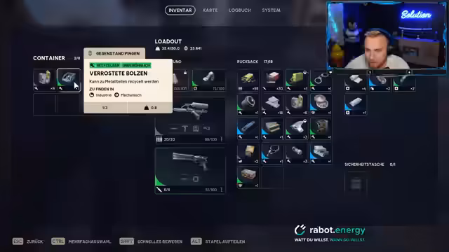 04:55:32Der Streamer bereitet sich auf ein neues Loadout vor und überlegt, welche Waffen und Ausrüstung er mitnehmen soll. Er erklärt, dass es nicht gut ist, wenn ein Spieler ein 'Slowdout' spielt und der andere nicht, da dies die Kampffähigkeit beeinträchtigt. Er lobt das Spiel als anfängerfreundlich, da es nur drei Munitionsarten und eine übersichtliche Anzahl von Waffen gibt, die in verschiedene Seltenheitsstufen unterteilt sind. Er empfiehlt, immer genügend Schildauflader dabei zu haben und die Werkbänke zu verfolgen, um Ressourcen zu sammeln. Er entdeckt einen goldenen Karabinerhaken, ein sehr seltenes Item, mit dem man sich an Maschinen schwingen kann. Sie planen, ein 'Damm Blitz Event' zu spielen, um doppelten Loot zu erhalten und weniger Maschinen in der Luft zu haben. Während des Streams treten jedoch massive Soundprobleme auf, die den Streamer frustrieren und seine Laune verderben. Er versucht, die Probleme zu beheben, vermutet aber einen Kabelbruch oder Schäden durch Stromausfälle. Er beschließt, den Stream abzubrechen und Paul, einen Techniker, um Hilfe zu bitten, um die Probleme zu beheben, damit er am nächsten Tag wieder streamen kann.