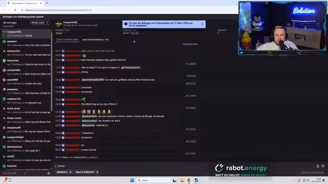01:00:01Ein Zuschauer, der als 'Erpel' angesprochen wird, entschuldigt sich für kindisches Verhalten, das zu einem Bann führte. Er beteuert, dass er normalerweise ein positives Mitglied des Chats sei und hofft auf eine zweite Chance. Die Diskussion dreht sich auch um die im Stream verwendete Sprache, wobei der Streamer betont, dass er großen Wert auf eine 'family-friendly und brand-safe' Umgebung legt. Dies führt zu Verwirrung und humorvollen Kommentaren im Chat, da die tatsächliche Sprachverwendung im Stream oft davon abweicht. Es werden weitere Entbannungsanträge behandelt, die oft humorvoll oder selbstironisch formuliert sind, und der Streamer zeigt sich meist gnädig.