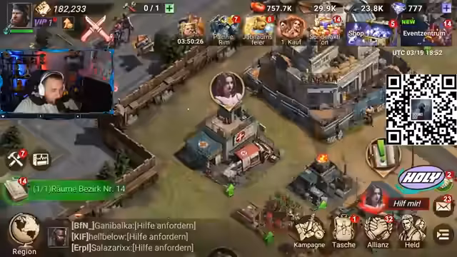01:31:55Es wird intensiv am Ausbau der Basis gearbeitet. Ressourcen werden eingesetzt, um das Hauptquartier auf Level 6 zu bringen und andere Gebäude auf Level 5 zu verbessern. Der Fokus liegt auf der Optimierung der Verteidigung und der Rekrutierung neuer Truppen. Es werden verschiedene Strategien ausprobiert, um die Siedlung mit Hilfe der Allianz zurückzuerobern, wobei Speere und andere Truppentypen zum Einsatz kommen. Ressourcenknappheit zwingt dazu, Ressourcenpakete zu öffnen, um den Ausbau voranzutreiben. Helden-Talente werden verbessert, um den Schaden an Reitertruppen zu erhöhen. Es wird überlegt, ob man alle Talente gleichmäßig oder einen einzelnen Talentbaum maximiert. Es gibt eine kurze Diskussion über die Möglichkeit, dem Spiel beizutreten und zur aktuellen Position zu ziehen. Es wird kurz auf die Möglichkeit hingewiesen, das Spiel durch Scannen eines QR-Codes herunterzuladen und den Streamer zu unterstützen.