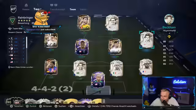 02:26:59Der Streamer beginnt mit der Vorbereitung auf den Weekend-League-Modus und stellt seine Teams für die anstehenden Spiele vor. Er analysiert die Stärken und Schwächen der aufgestellten Spieler, wobei Kim Jong-Un in der Abwehr als potenzieller Schwachpunkt identifiziert wird. Auch die Mitspieler werden gebeten, ihre Teams zu präsentieren, was eine Runde der gegenseitigen Einschätzung und Bewertung der Konkurrenz auslöst.