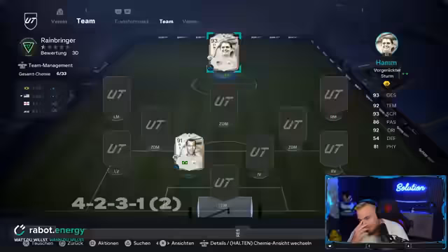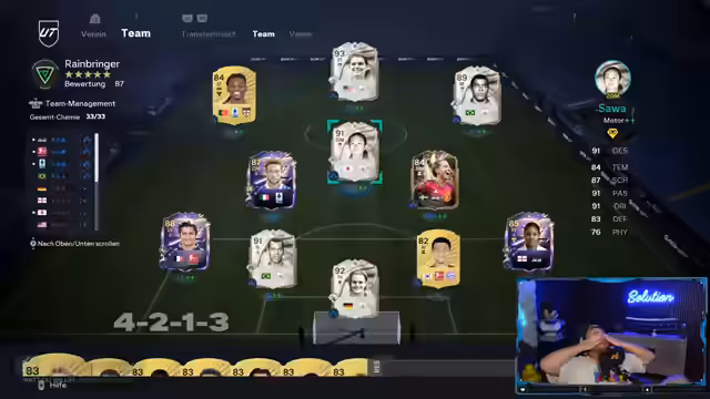 00:31:29Der Streamer plant, zwei Weekend Leagues zu spielen: eine heute und eine morgen, da morgen der letzte Tag ist. Der aktuelle Account soll zukünftig für die Open Mic Challenge genutzt werden, um dort Coins zu sammeln, während der Main-Account für den 'Full Tryhard' mit den besten Spielern reserviert ist. Er hat bereits 10 Millionen Coins auf dem Main-Account und ein starkes Team, das durch den Kauf von Ronaldo und David Beckham verstärkt wurde. Beckham wird besonders für seine OP-Seitenwechsel und den 'harter Pass-Trade' gelobt, während Son, trotz seines günstigen Preises, einen sehr guten Eindruck macht, insbesondere durch seinen goldenen Finesse-Trade und Flachschuss-Trade. Ronaldo hat bisher jedoch noch kein Kopfballtor erzielt. Für die Open Mic Challenge werden Mia Hamm und Cannavaro als 'saved' Spieler ausgewählt, um ein starkes Fundament zu legen. Die Formation 4-4-2 wird bevorzugt, da der Streamer sich damit am wohlsten fühlt und zwei Stürmer sowie zwei ZDMs spielen möchte. Es wird auch diskutiert, dass die Team-Anzeige der Gegner nicht mehr geskippt werden soll, um Schwachstellen wie Bronze-Spieler auf bestimmten Positionen gezielt ausnutzen zu können. Ein Hero-Pack wird geöffnet, in der Hoffnung auf einen starken Spieler, und es wird die Möglichkeit einer SBC (Squad Building Challenge) in Betracht gezogen, um das Team weiter zu verbessern.