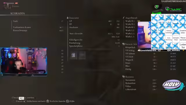 04:47:15Der Streamer diskutiert die Schwierigkeiten, die Schradin bei bestimmten Bosskämpfen hat, insbesondere bei Margit und den geplanten Kampf gegen Godric. Er analysiert, dass Schradins aktueller Build und Level-Up für Godric ungeeignet sind und schlägt alternative Builds wie den Einsatz von Hammers oder speziellen Talismanen vor. Gleichzeitig werden Strategien zur Verbesserung von Schadensoutput und Leben diskutiert, um die Chancen auf einen Sieg zu erhöhen.