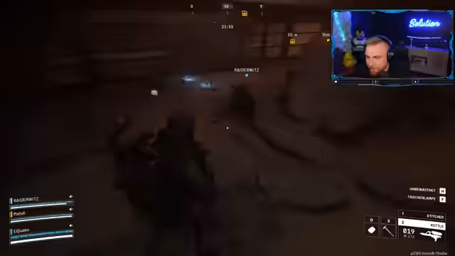 03:19:17Der Streamer und sein Team geraten in ein Dorf, das als Hotspot für Action beschrieben wird. Es kommt zu einem heftigen Kampf mit mindestens zwei feindlichen Teams. Der Streamer wird in ein Sandwich-Manöver gedrängt und ist ohne Schild nahe am Tod. Durch eine Wiedereinführung mit einem Defi kann er in den Kampf zurückkehren und beginnt eine Gegenoffensive mit Rauchgranaten, um den Gegner von der Seite zu attackieren. Die Situation bleibt jedoch extrem gefährlich und unübersichtlich.